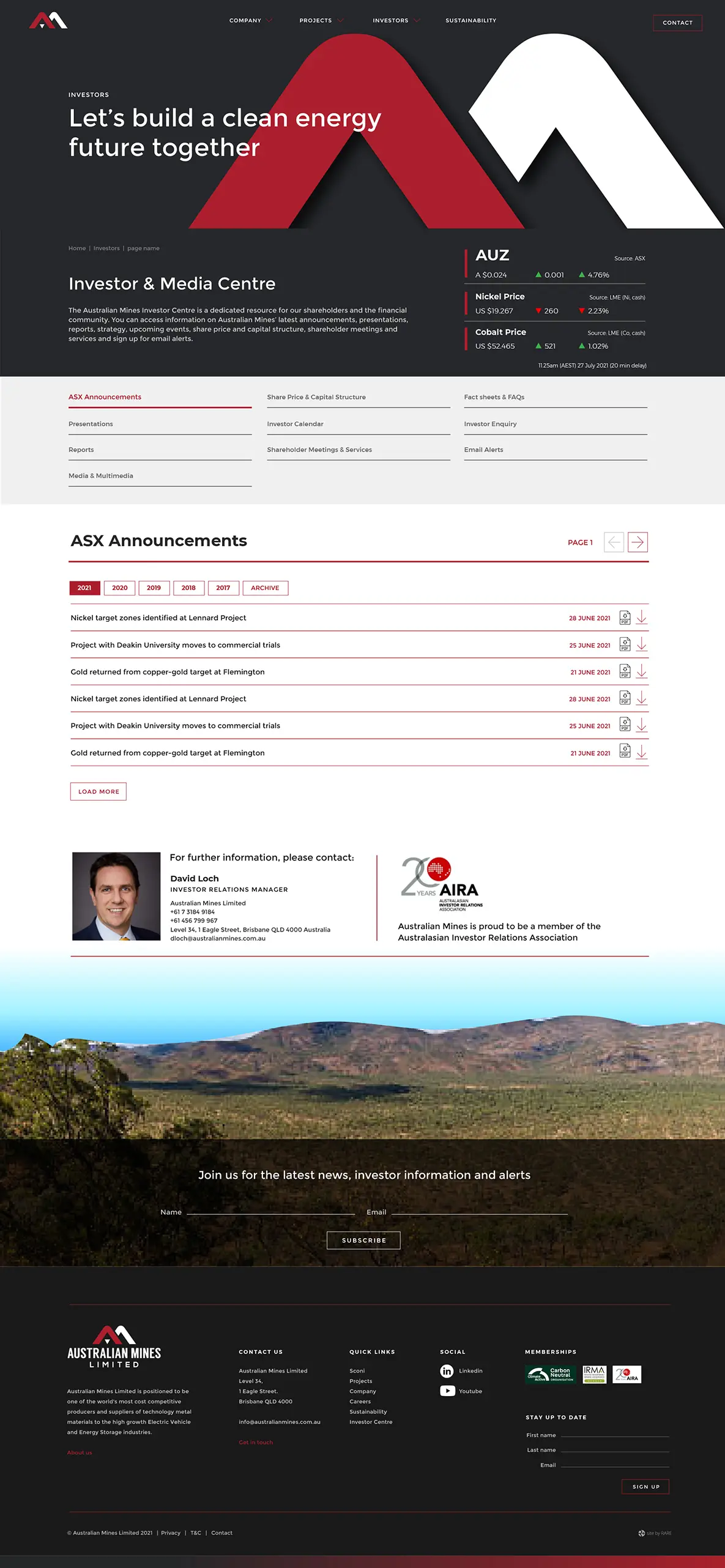 Australian Mines is the first certified carbon neutral mining organisation in Australia, as such the website's focus definitely reflects this. Our strategy was to engage potential investors in the clean energy resources market by showing the end use, outcomes and benefits of clean energy resources. Mining traditionally has had an image problem, but resources for technology minerals are under ever increasing demand and the end use and environmental benefits has begun to tilt this perception.